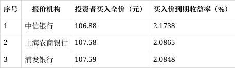 8月23日,中央国债登记结算有限责任公司官网披露柜台流通式债券报价信息,“23附息国债04”(代码230004)最优买报价方为中信银行,该债券剩余期限8年186天,投资者最优买入价到期收益率2.1738%。