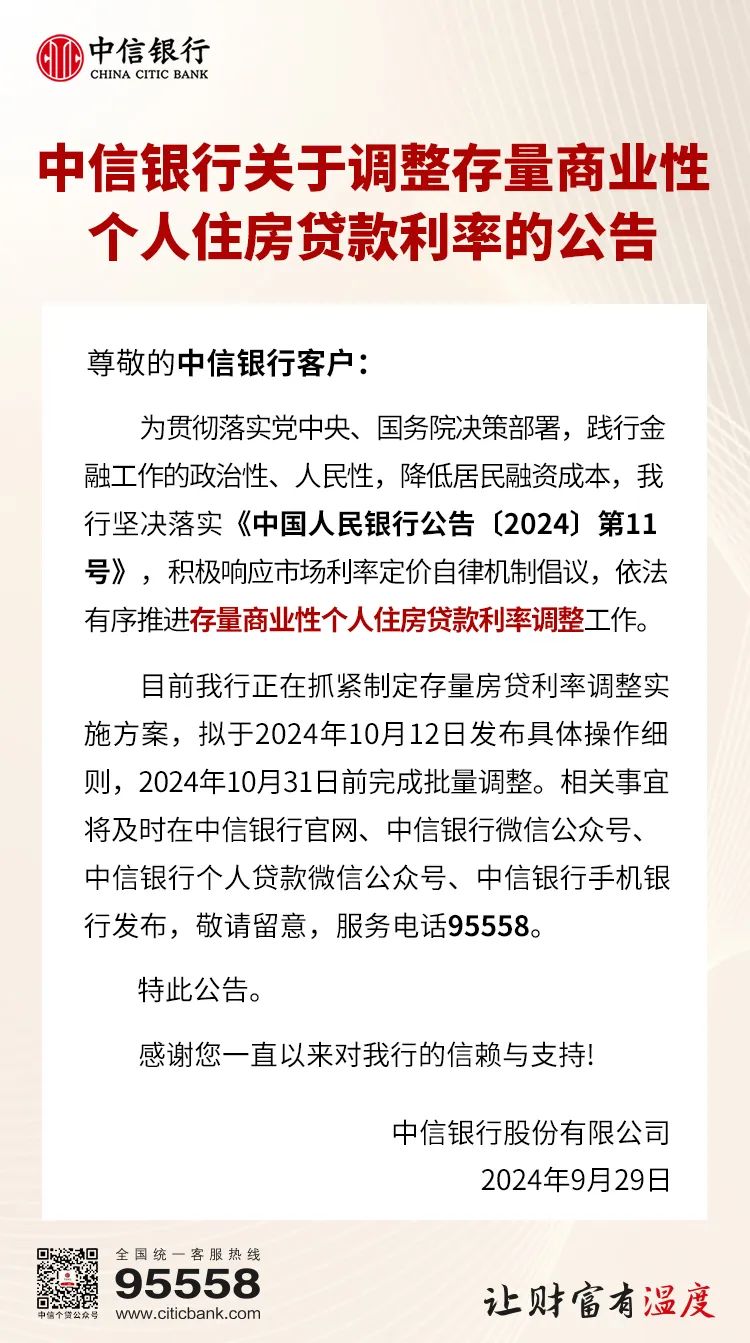 中信银行关于调整存量商业性个人住房贷款利率的公告