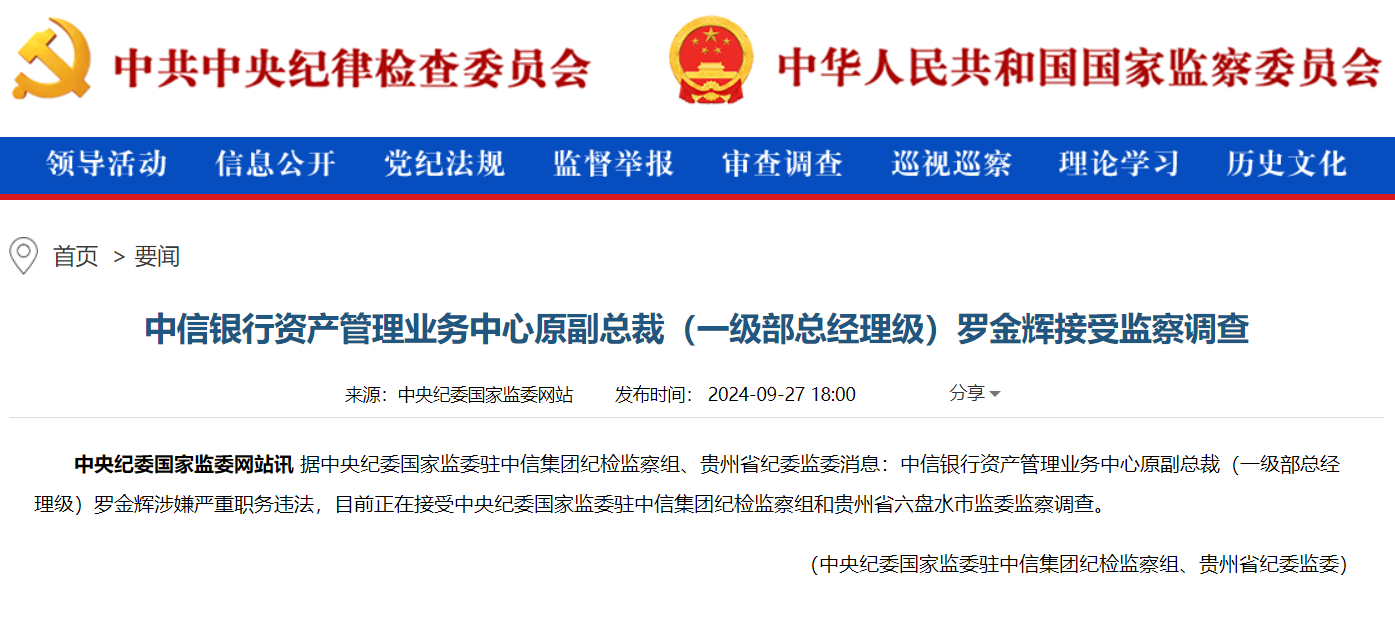 日前,中央纪委国家监委网站发布消息称,据中央纪委国家监委驻中信集团纪检监察组、贵州省纪委监委消息:中信银行资产管理业务中心原副总裁(一级部总经理级)罗金辉涉嫌严重职务违法,目前正在接受中央纪委国家监委驻中信集团纪检监察组和贵州省六盘水市监委监察调查。