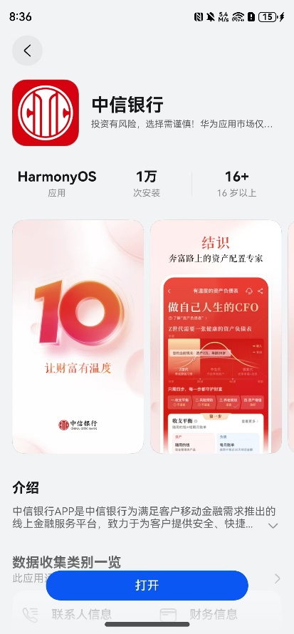 华为HarmonyOS NEXT系统已于10月8日开启公测,中信银行App应用也同步在HarmonyOS NEXT应用市场上架,为广大用户带来全新金融体验。