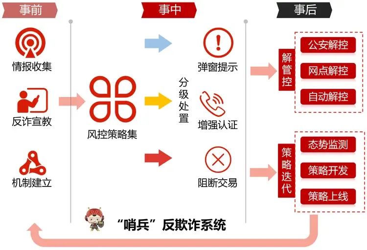 “哨兵”反欺诈风控体系按照“内外联通、攻防智能、敏捷运营”的建设思路,建立了“情报整合→风险识别→协同处置→核查迭代”的全流程闭环运营机制。在欺诈交易关键链路上有效整合内外情报数据,并利用大数据、机器学习等AI技术,实现被诈交易的精准识别,通过交互式智能识别客户意图,及时发现潜在受害客户,借助总分支三级联动响应机制,快速触达客户,第一时间协助客户摆脱诈骗人员的洗脑控制,保护客户资金安全。