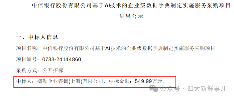 根据之前发布的《中信银行股份有限公司基于AI技术的企业级数据字典制定实施服务采购项目招标公告》,项目概况及投标人资格要求如下: