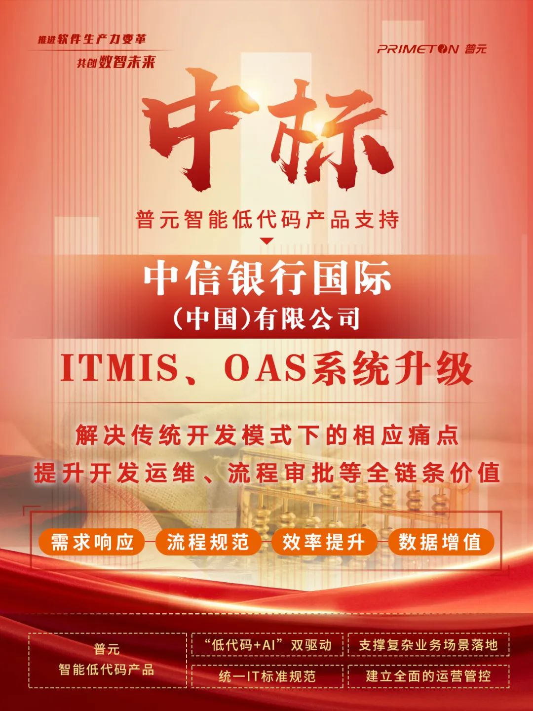 中标!普元智能低代码支持中信银行国际(中国)ITMIS、OAS系统升级