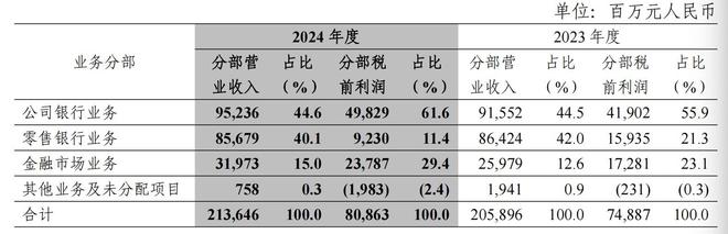 去年该行公司业务分部营收和税前利润较2023年分别增长了4.02%、18.92%。涵盖资金资本市场业务、金融同业业务的金融市场业务分部去年营收和税前利润也实现了“双增”,分别增长了23.07%、37.65%。