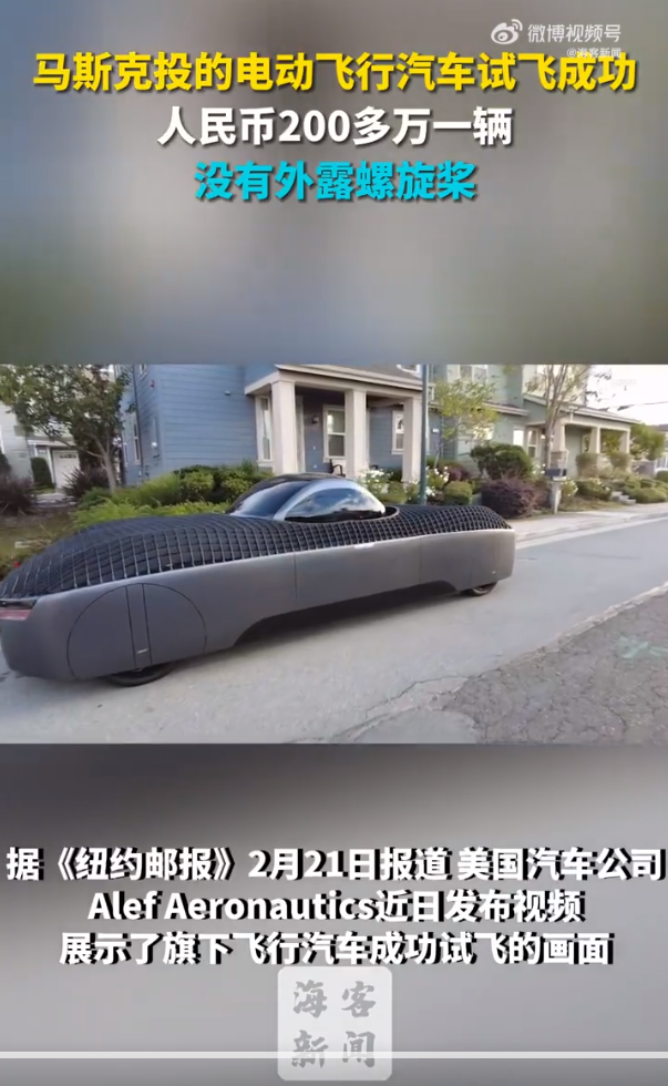 另据海客新闻官方微博2月22日消息,《纽约邮报》2月21日报道称,美国汽车公司Alef Aeronautics近日发布视频,展示了旗下飞行汽车成功试飞的画面。
