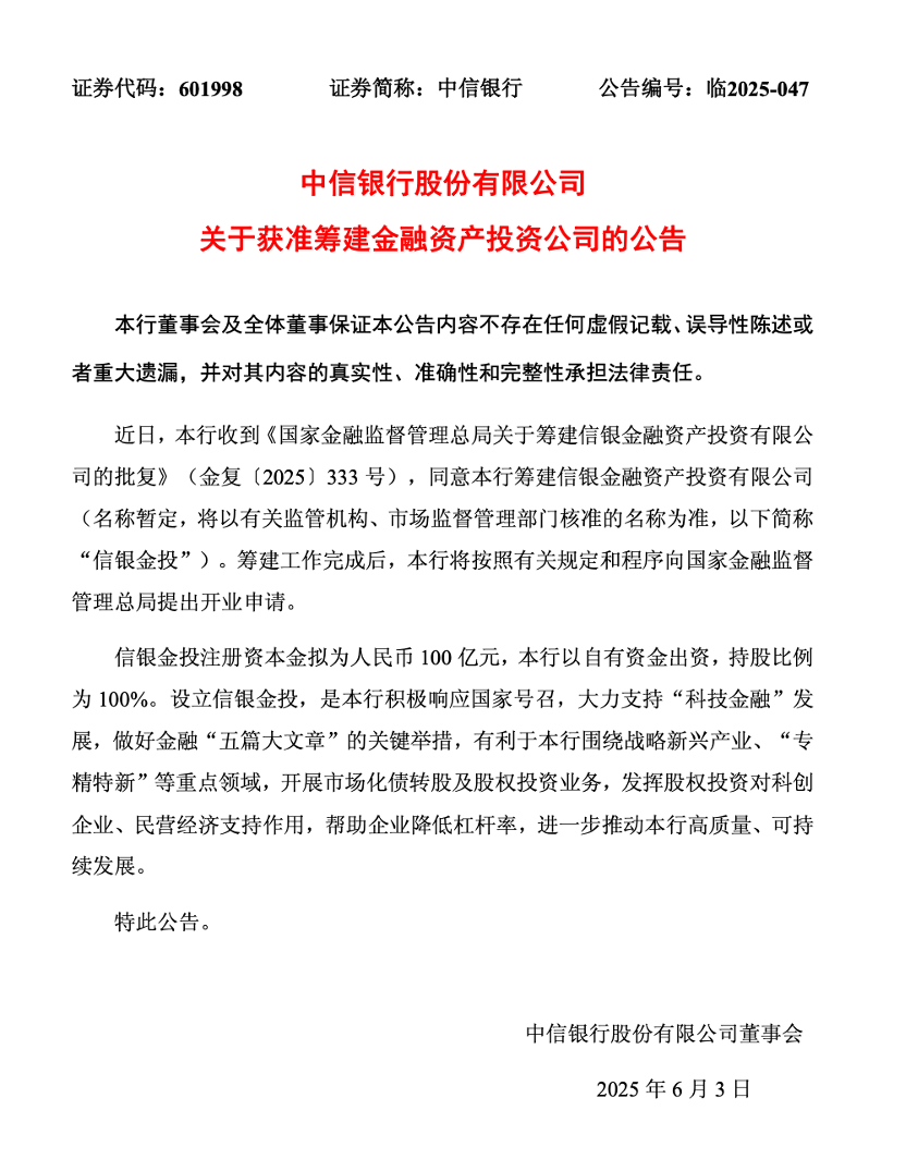 6月3日,中信银行发布公告称,收到国家金融监督管理总局批复,同意其筹建信银金融资产投资有限公司(名称暂定,以下简称“信银金投”)。这也成为继兴业银行之后,第二家官宣获准筹建金融资产投资公司(AIC)的股份制银行。