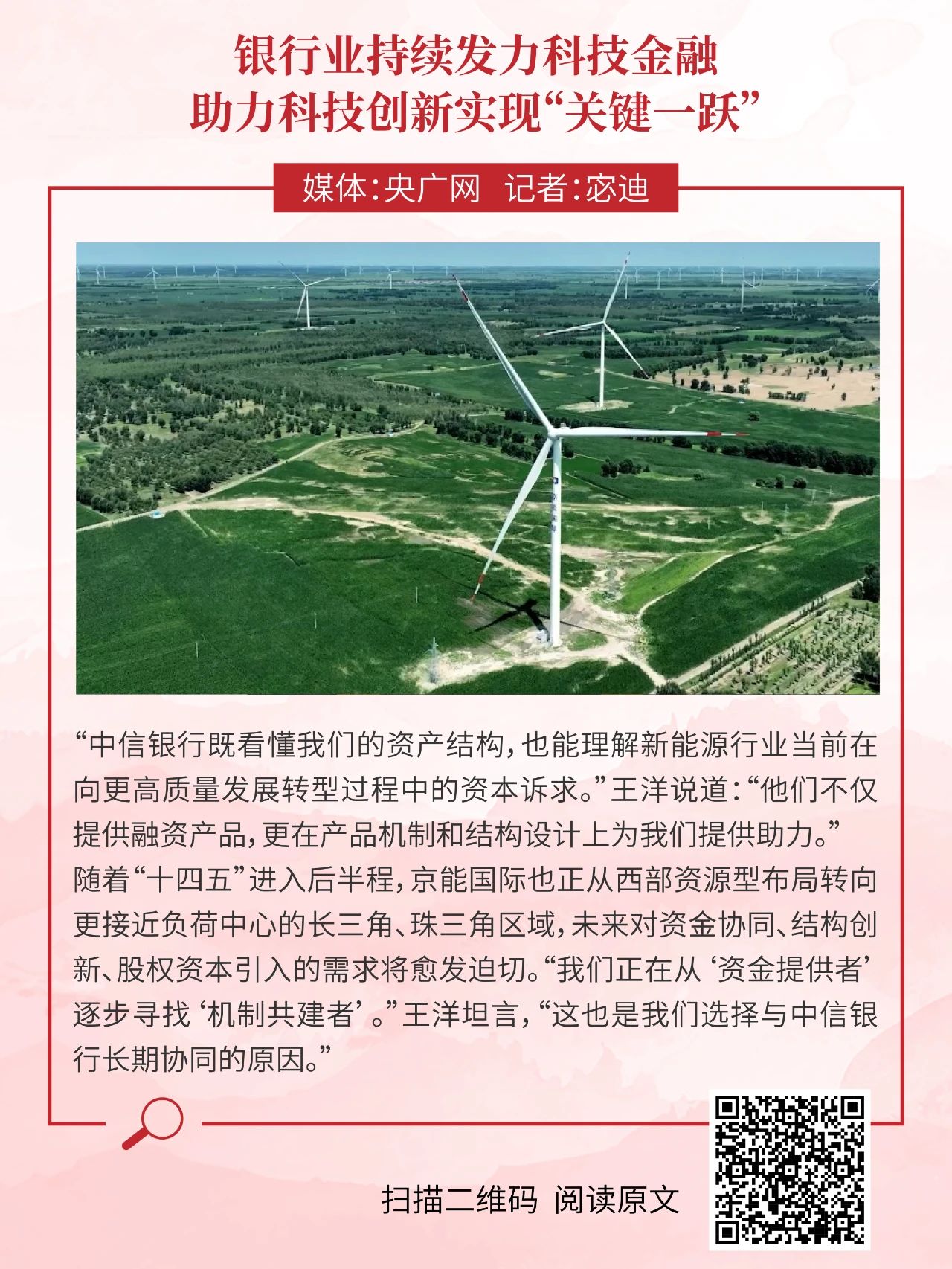 中信银行通过多元化金融工具深度布局新能源产业,在光伏领域以全周期金融方案赋能产业升级,助力绿色能源高质量发展。作为北京国资体系下新能源产业的重要平台,京能国际在过去五年实现了装机规模和资产规模的快速跃升。截至2023年底,控股装机容量已接近1500万千瓦,资产规模突破千亿元大关,成为京能集团首家“千亿子公司”。在企业发展的多个关键节点,中信银行持续提供多层次服务支持。从最初的流动贷款,到通过中信银行理财子公司协同支持,再到参与公司资产证券化安排、公募REITs发行,中信银行打通了金融协同通道,形成了以总分支三级联动为支撑的“科技金融服务场”。