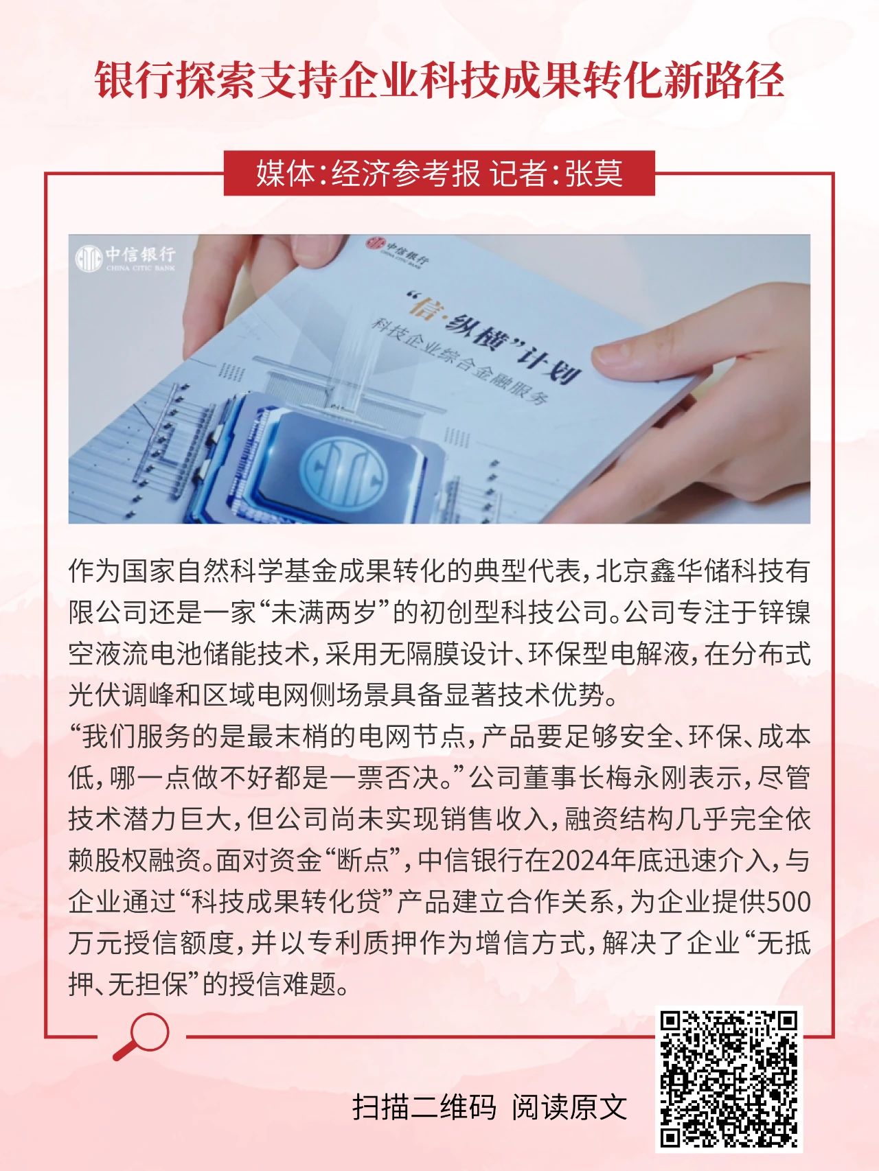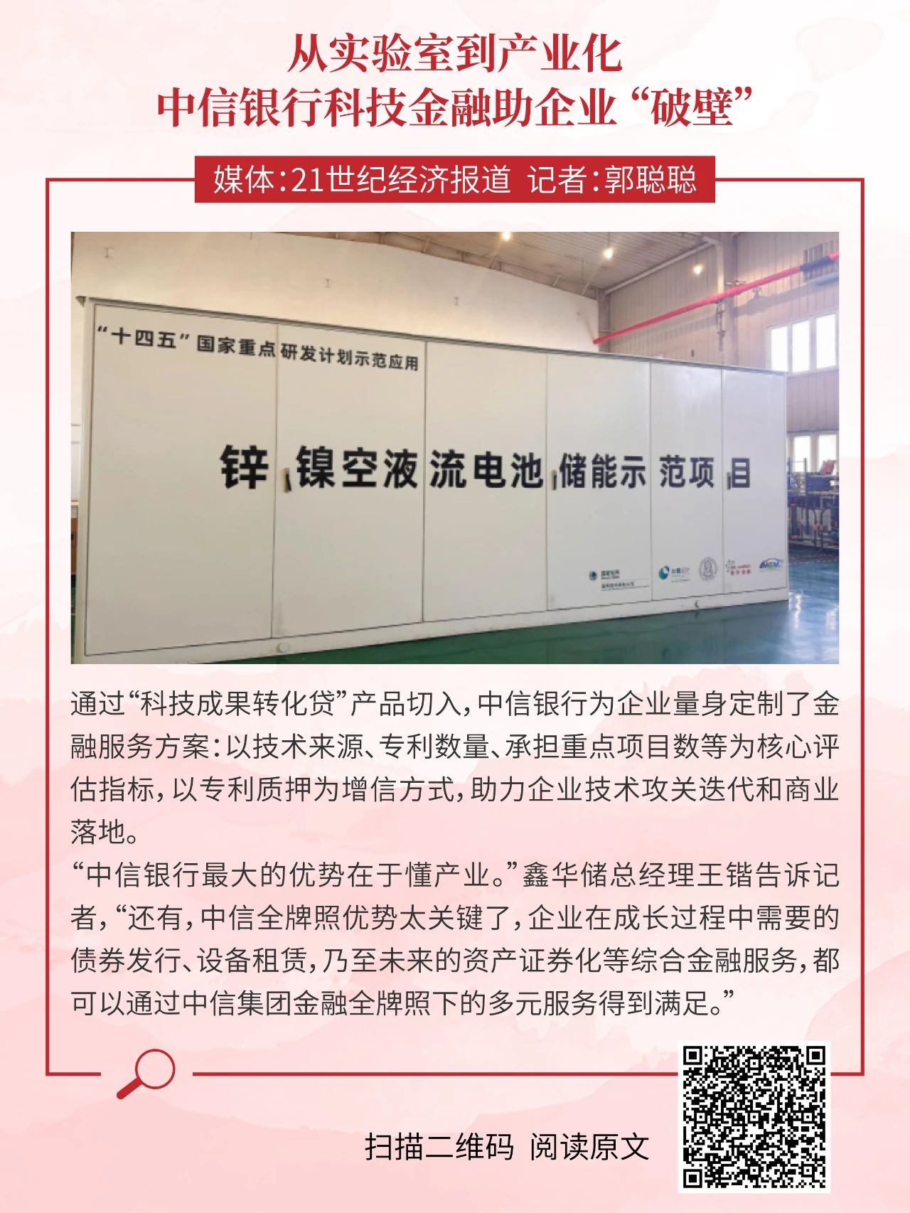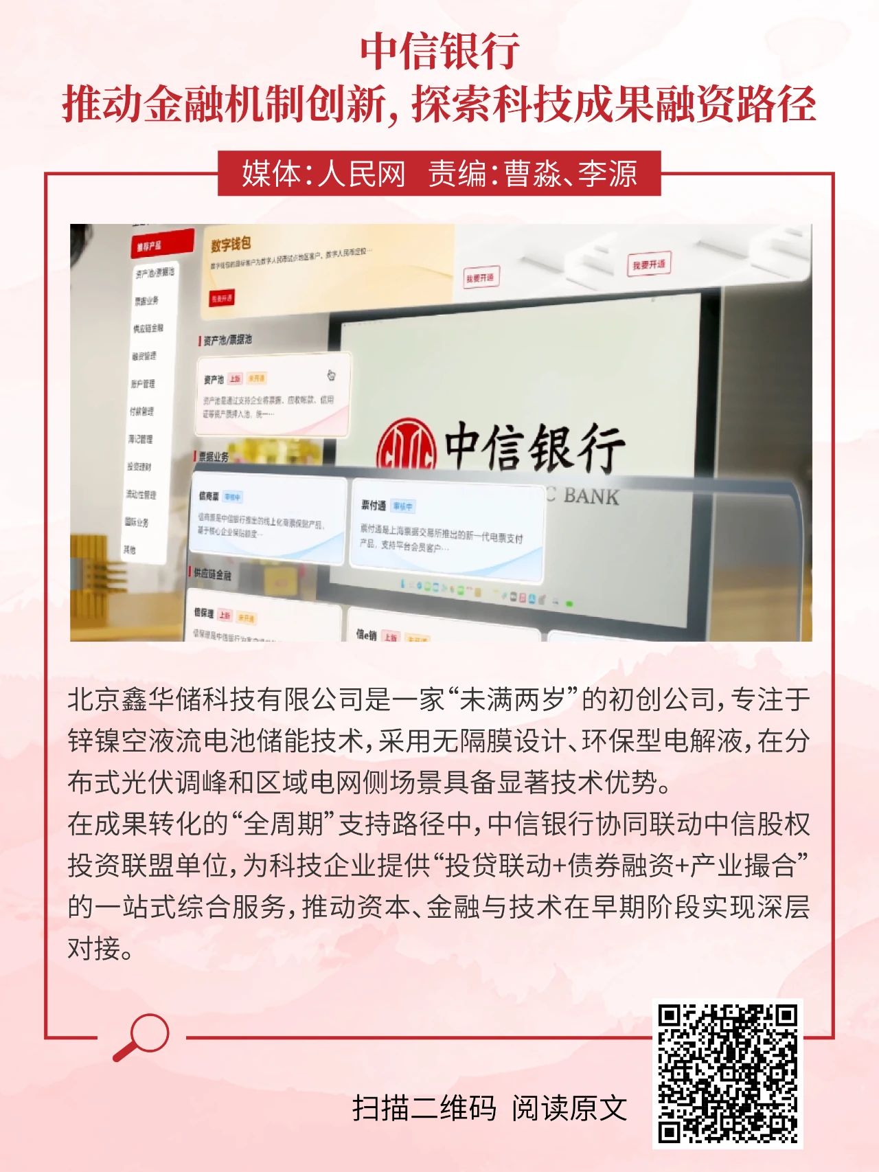 在新能源赛道,北京鑫华储科技有限公司研发的锌镍空液流电池技术,以无隔膜设计突破传统储能瓶颈,却因产品未上市面临资金压力。中信银行依托科技成果转化贷,为企业开辟“1+2快速审批通道”,48小时内完成500万元授信审批,支持其技术迭代与示范项目建设。目前,该技术已入选国家自然科学基金优秀成果,中信银行的资金支持正助力绿色储能从实验室走向电网应用场景。