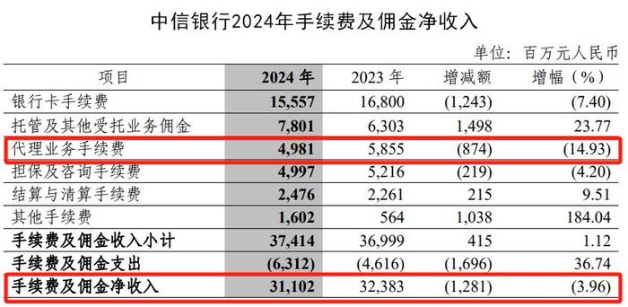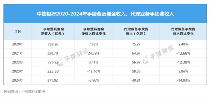 代理业务手续费的收缩态势明显。从2020年的75.27亿元,回落至2024年的49.81亿元,五年缩水33.82%。