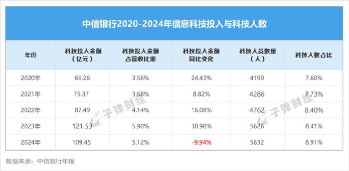 横向对比来看,中信银行科技资金投入规模处于同业领先水平。2024年,部分股份行披露的科技资金投入分别为,招行133.5亿元、兴业银行83.77亿元、浦发银行71.69亿元。