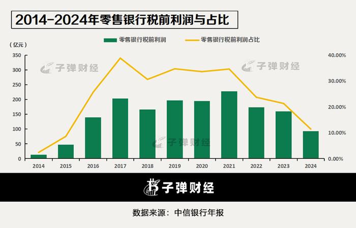 尤其是2024年,零售银行税前利润处于近九年最低,同比下滑高达42.08%。