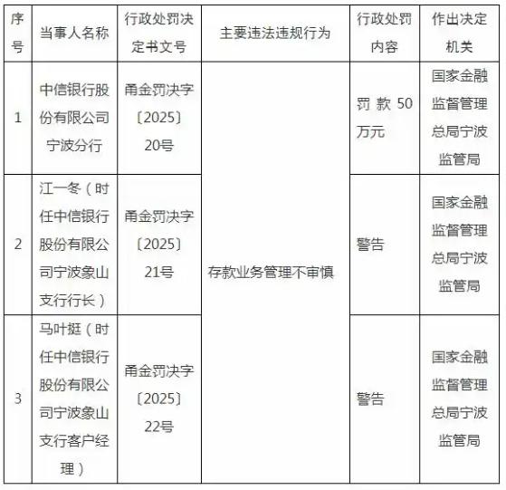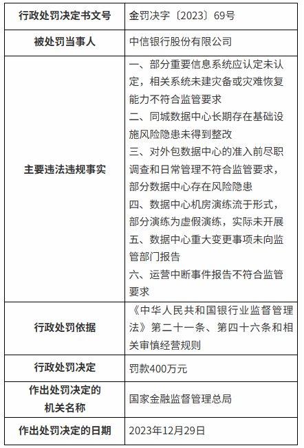 此前,该行2023年末被罚没超2.24亿元,曾引发行业巨震。罚单显示,中信银行违法违规事实高达56项。该行提出处罚所涉问题均发生在2019年及以前年度,已全部完成整改,并对相关责任人严肃处理。
