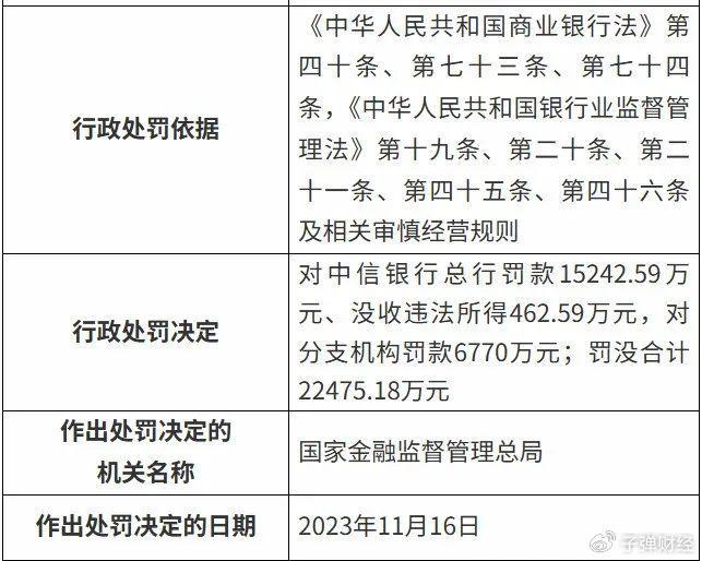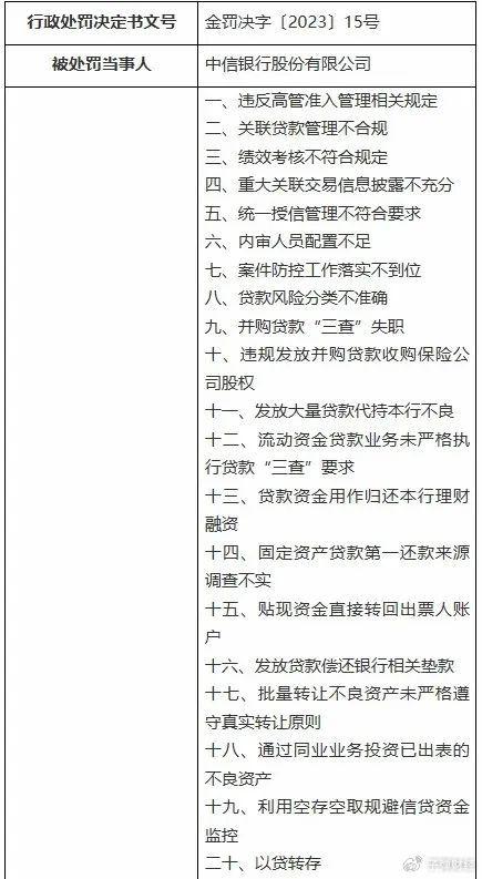 图/中信银行2023年罚单超2.24亿(来源:金融监管总局官网)说明:由于处罚项目过多,上图仅展示前20项处罚事由