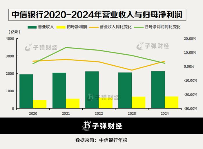 回顾该行近五年的经营业绩,可明显看出增速乏力的迹象。其中,营业收入在2023年同比下滑2.6%,降至近五年最低,2024年同比增速回升至3.76%。归母净利润增速从2021年的13.6%,直线降至2024年的2.33%,降幅较为明显。