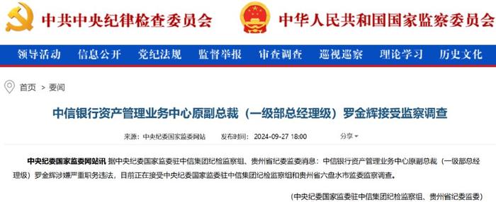 2024年9月末,中央纪委国家监委网站发布消息称,中信银行资产管理业务中心原副总裁(一级部总经理级)罗金辉涉嫌严重职务违法,已接受中央纪委国家监委驻中信集团纪检监察组和贵州省六盘水市监委监察调查。