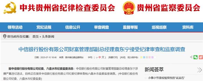 7月10日,贵州省纪委监委网站发布公告称,中信银行财富管理部副总经理袁东宁涉嫌严重违纪违法,目前正在接受该行纪委纪律审查和六盘水市监委监察调查。