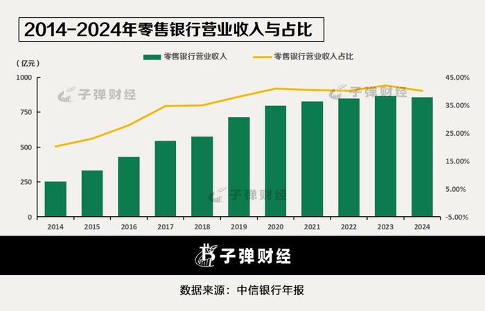 一是在零售银行营业收入上,此前整体稳定增长,然而近两年出现下滑,从2023年的864.24亿元降至2024年的856.79亿元。虽然没有达成既定目标,但营收占比从2014年的20.2%提升到2024年40.1%,零售转型取得一定成效。