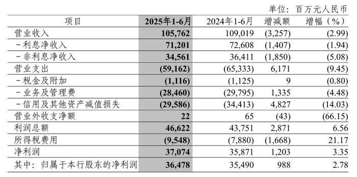 业绩数据显示,该行上半年实现营业收入1057.6亿元,同比下降3%;归属于母公司股东的净利润364.8亿元,同比增长2.8%,其中二季度单季净利润同比增速提升至4.1%。