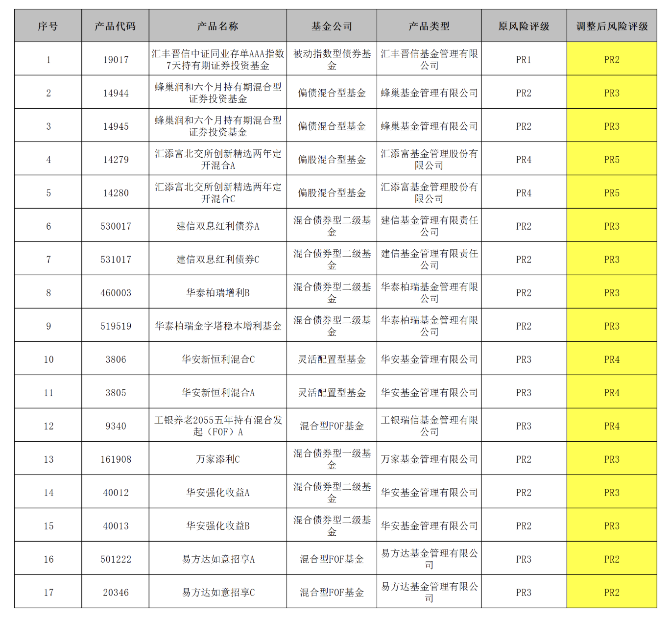 公告显示,中信银行将自2025年10月15日起,陆续调整17只代销资产管理产品的风险评级,涉及汇添富基金、华泰柏瑞基金、华安基金、易方达基金等基金公司产品。其中,15只产品风险评级上调,2只产品风险评级下调。