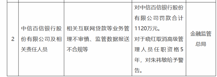 9月30日,国家金融监督管理总局官网公示的行政处罚决定书显示,中信百信银行因相关互联网贷款等业务管理不审慎、监管数据报送不合规等违法违规行为,合计被罚1120万元;相关责任人于晓红被取消高级管理人员任职资格5年,朱祎敏被给予警告。