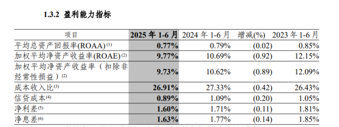 半年报还显示,中信银行的盈利能力承压。报告显示,报告期内,该行净息差为1.63%,同比下降0.14个百分点;净利差为1.60%,同比下降0.11个百分点;生息资产收益率为3.33%,同比下降0.50个百分点,付息负债成本率为1.73%,同比下降0.39个百分点。记者注意到,已披露半年报的11家股份行中,除渤海银行净息差微增1个基点外,其余银行均出现不同程度收窄,其中中信银行收窄幅度为最大的两家银行之一,下降14个基点。