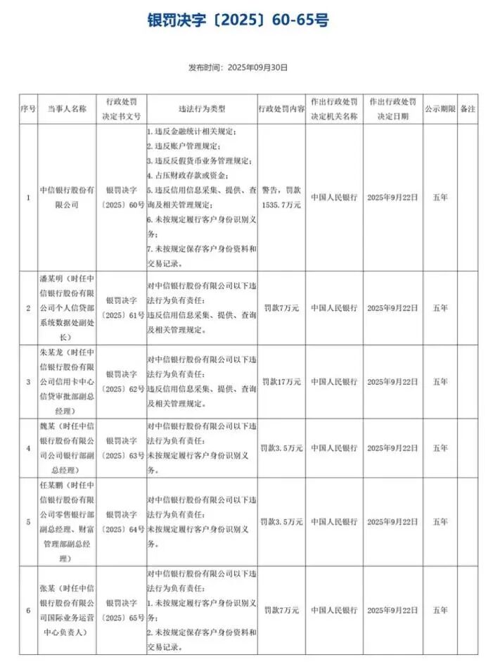 9月30日,中国人民银行网站发布的《银罚决字〔2025〕60-65号》显示,中信银行被警告并被罚款1535.7万元。具体违法行为包括:违反金融统计相关规定,违反账户管理规定,违反反假货币业务管理规定,占压财政存款或资金,违反信用信息采集、提供、查询及相关管理规定,未按规定履行客户身份识别义务,未按规定保存客户身份资料和交易记录。