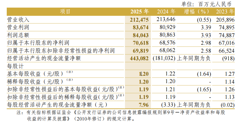 不过,将合并报表与母行报表加以对照,年报呈现出另一层变化。2025年该行营业收入为1941.64亿元,低于上年的2003.15亿元,该行净利润为647.01亿元,低于上年的663.72亿元。集团净利润保持增长,但母行报表中的营业收入和净利润均低于上年,集团报表与母行报表的变化并不同步。