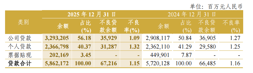 从中信银行2025年度报告数据看,零售银行业务分部利润占比较上年下降的同时,个人贷款不良率较上年末上升,公司贷款不良率较上年末下降。2025年末,集团个人贷款余额为23667.98亿元,较上年末增长0.20%,个人不良贷款率较上年末上升0.07个百分点;与此相对,公司贷款余额较上年末增长13.24%,公司不良贷款率较上年末下降0.18个百分点。