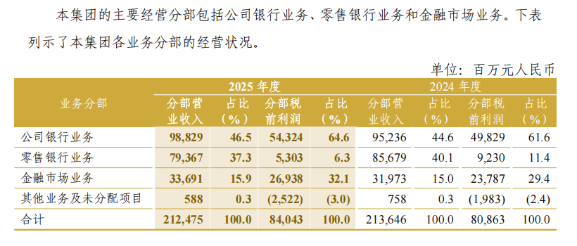 零售银行利润贡献的变化,是中信银行2025年度报告中一个值得关注的地方。按分部数据来看,2025年公司银行业务营业收入为988.29亿元,较上年增长,分部税前利润为543.24亿元,较上年增长;金融市场业务营业收入为336.91亿元,分部税前利润为269.38亿元,均高于上年。零售银行业务则不同,营业收入为793.67亿元,低于上年的856.79亿元,分部税前利润为53.03亿元,低于上年的92.30亿元。