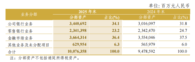 进一步看,零售银行业务分部资产与上年末接近,但利润占比较上年下降。2025年末零售银行分部资产为23413.98亿元,上年末为23424.70亿元,变化并不大,但分部税前利润已降至53.03亿元,占利润总额的比重为6.3%,上年为11.4%。同样是一块资产规模较大的业务,与上年相比,2025年零售银行业务分部利润占比明显下降。