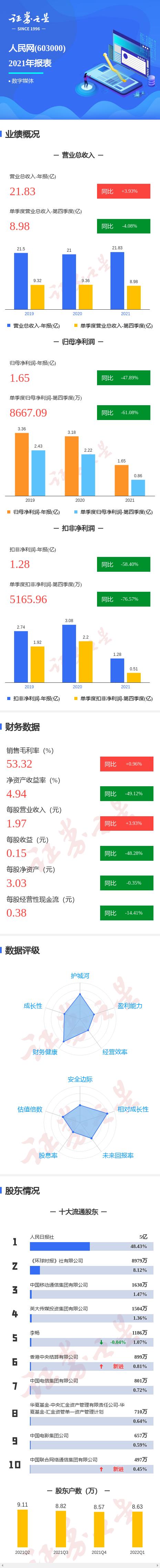 人民网2021年报显示,公司主营收入21.83亿元,同比上升3.93%;归母净利润1.66亿元,同比下降47.89%;扣非净利润1.28亿元,同比下降58.4%;其中2021年第四季度,公司单季度主营收入8.98亿元,同比下降4.08%;单季度归母净利润8667.1万元,同比下降61.08%;单季度扣非净利润5165.96万元,同比下降76.57%;负债率29.56%,投资收益-11458.47万元,财务费用1969.77万元,毛利率53.32%。