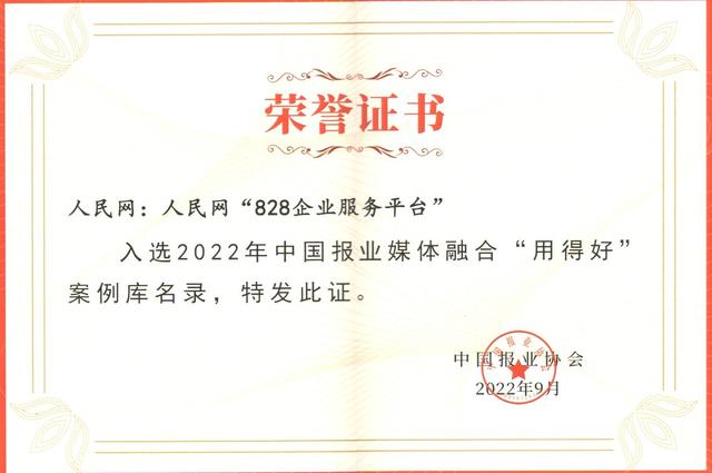 日前,经中国报业技术奖项专家委员会评审,人民网“828企业服务平台”入选“2022年中国报业媒体融合‘用得好’案例库名录”,并获得中国报业协会颁发的荣誉证书。