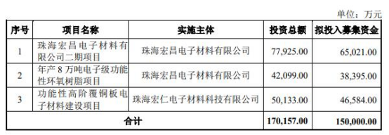 珠海宏昌电子材料有限公司二期项目总投资77925.00万元,拟使用募集资金65021.00万元,建设期24个月。该项目完全达产后预计可实现年营业收入308000.00万元,年净利润17133.07万元,内部收益率为17.23%(所得税后),静态投资回收期(税后,含建设期)为7.14年。项目建设期为2年。项目实施主体为珠海宏昌电子材料有限公司。