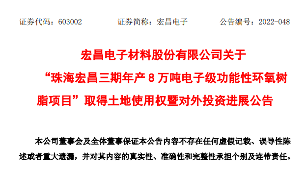 9月19日,宏昌电子发布公告称:“珠海宏昌三期年产8万吨电子级功能环氧树脂项目”已取得土地使用权。