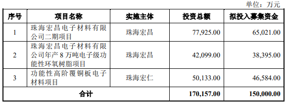 此前公司披露拟向特定对象发行股票募资总额不超过15亿元(含本数),扣除发行费用后的募集资金拟全部用于珠海宏昌电子材料有限公司二期项目、珠海宏昌电子材料有限公司年产8万吨电子级功能性环氧树脂项目、功能性高阶覆铜板电子材料项目。