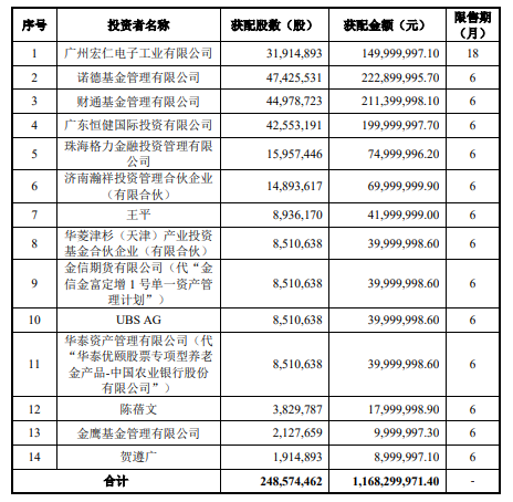 宏昌电子10月13日发布向特定对象发行A股股票发行情况报告书,本次向特定对象发行股票的数量为2.48亿股,本次发行价格为4.7元/股,募集资金额为11.68亿元,广州宏仁、诺德基金、财通基金等14家获配。