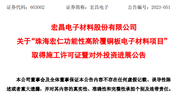 11月10日,宏昌电子发布关于“关于“珠海宏仁功能性高阶覆铜板电子材料项目”取得施工许可证暨对外投资进展公告。
