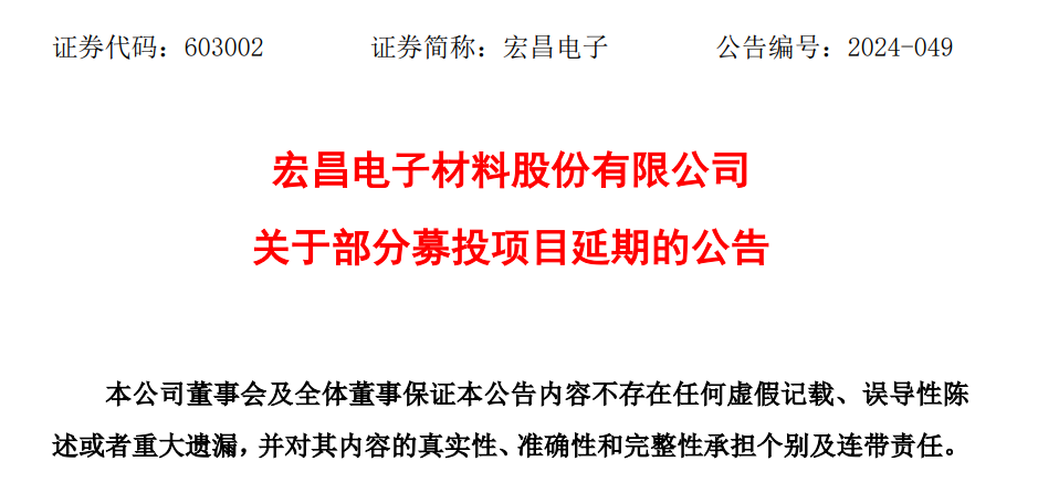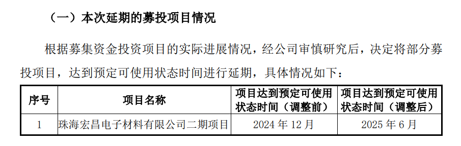近日,宏昌电子材料股份有限公司发布公告,董事会审议通过了《关于部分募投项目延期的议案》,同意公司结合当前募投项目实际进展情况,并基于审慎性原则,在不改变募投项目实施主体、募集资金用途及投资规模的情况下,将募投项目“珠海宏昌电子材料有限公司二期项目”达到预定可使用状态的日期,由2024年12月延期至2025年6月。