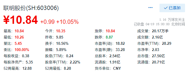 乐居财经讯刘治颖 4月19日,截至收盘,联明股份(SH603006)涨停,上涨10.05%,现报10.84元,成交额2.16亿元,总市值27.56亿元。