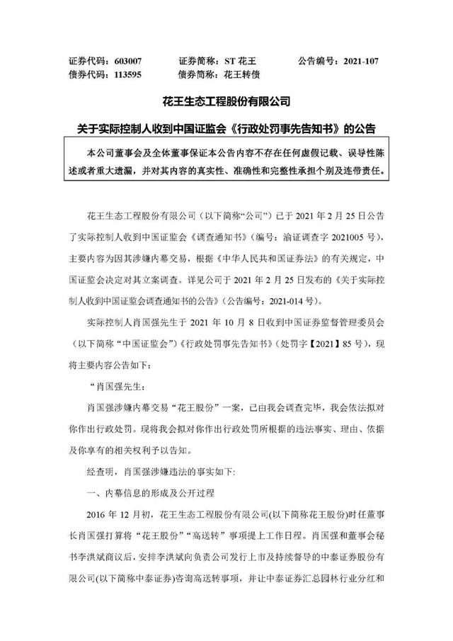 10月8日,ST花王晚间公告,公司实控人肖国强收到中国证监会《行政处罚事先告知书》。肖国强涉嫌内幕交易“花王股份”一案,已由证监会调查完毕,证监会依法拟对其作出行政处罚,拟决定:责令肖国强处理非法持有的证券,没收违法所得879万元,并处以2637万元的罚款。