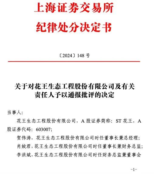 8月9日晚间,上海证券交易所下发关于对花王生态工程股份有限公司(以下简称“ST花王”或“公司”)及有关责任人予以通报批评的决定。上交所称,ST花王在信息披露、规范运作方面,有关责任人在职责履职方面,存在募集资金临时补充流动资金未及时归还、公司2023年年报存在多处错误等违规行为。上交所决定,对ST花王及时任董事长兼总经理贺伟涛、时任董事长兼财务总监肖姣君、时任财务总监兼董事会秘书李洪斌予以通报批评。