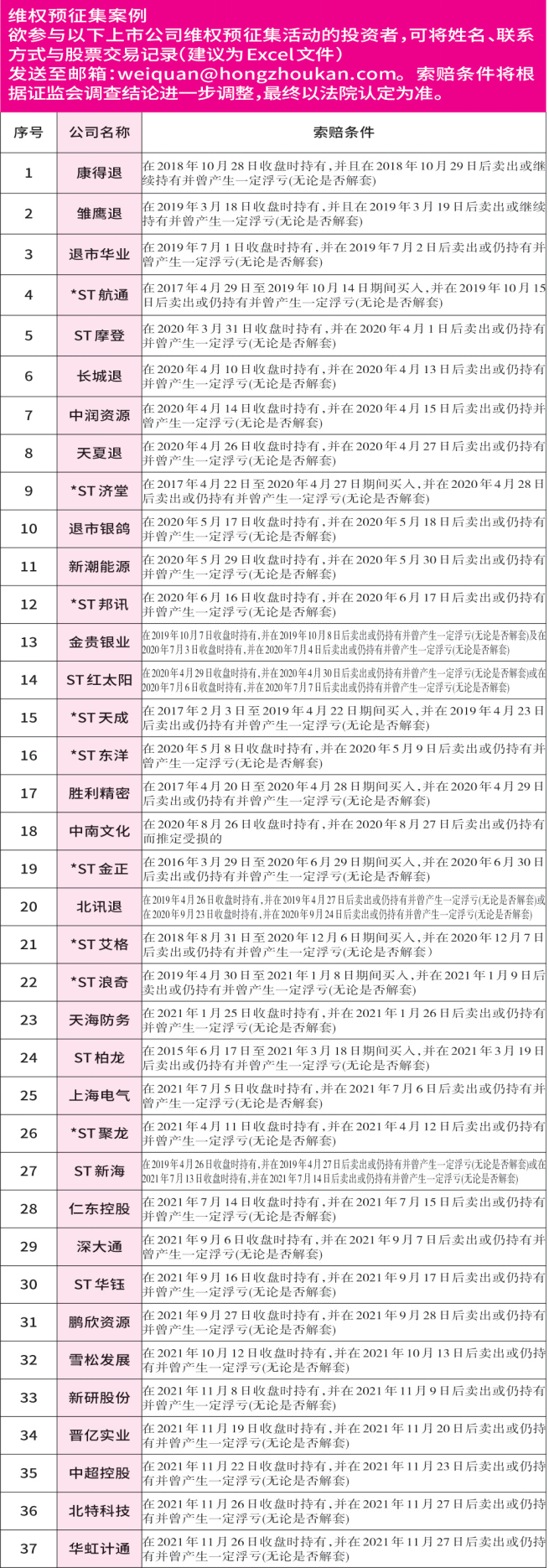 针对此次被查,还需以证监会调查结果为准。基于以上违法事实,根据相关司法解释,如果投资者于2021年11月26日收盘时持有北特科技,并在2021年11月27日后卖出或仍持有并曾产生一定浮亏(无论是否解套)均可发起索赔,您只需将姓名、联系电话与交易记录(建议为Excel文件)发送到weiquan@hongzhoukan.com的邮箱,参与由《证券市场红周刊》“民间维权”栏目组织的索赔预征集活动,以维护自身合法权益。广大投资者在获得赔偿前无需支付任何律师费用。