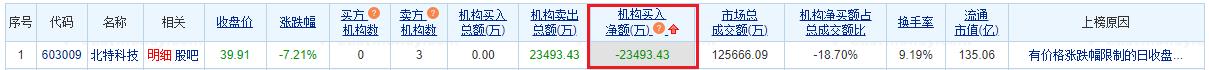 龙虎榜数据显示,北特科技卖出金额最大的前五名中,有3家机构专用席位。经统计,北特科技的机构席位今日净卖出金额为23493.43万元。