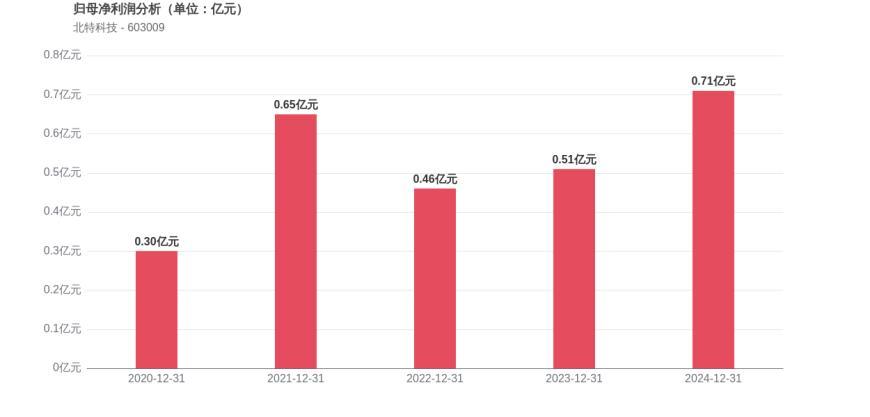 利润角度分析,2020年北特科技实现归母净利润0.30亿元,2024年0.71亿元。公司净利润在经历2022年的下滑后,近两年重新回到增长轨道。