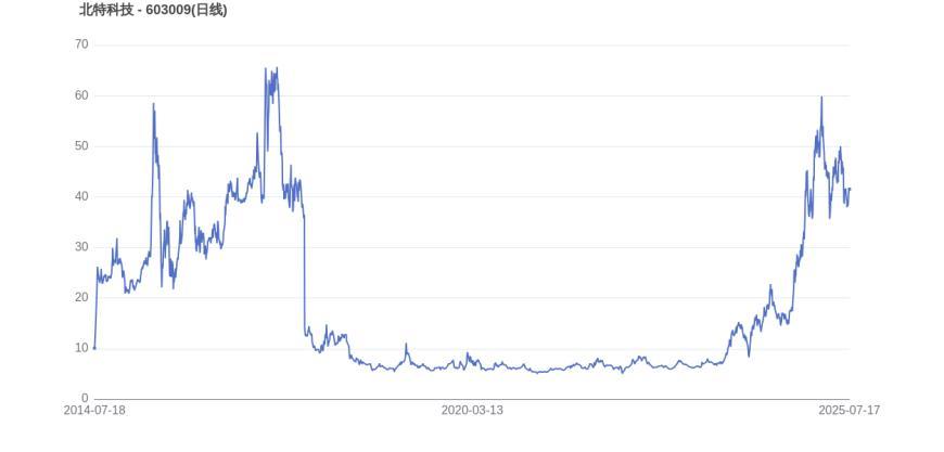 从上市首日至今,北特科技的市值实现了12.06倍的增长,显示出较强的成长性。2025年2月26日,北特科技的市值巅峰达到204.06亿元,股价也顺应升至60.28元。而至7月17日收盘,北特科技的股价为41.53元,市值为140.59亿元,相比峰值时期市值减少63.47亿元,市值蒸发了31.10%。