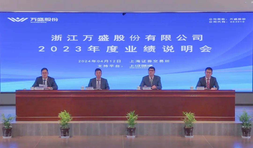 2024年4月12日上午,万盛股份在上证路演中心以视频直播及网络互动形式召开2023年度业绩说明会。公司董事长高献国先生、董事兼总裁周三昌先生、独立董事陈良照先生(线上参会)、副总裁兼CFO宋瑞波先生及副总裁兼董事会秘书钱明均先生出席了本次说明会。