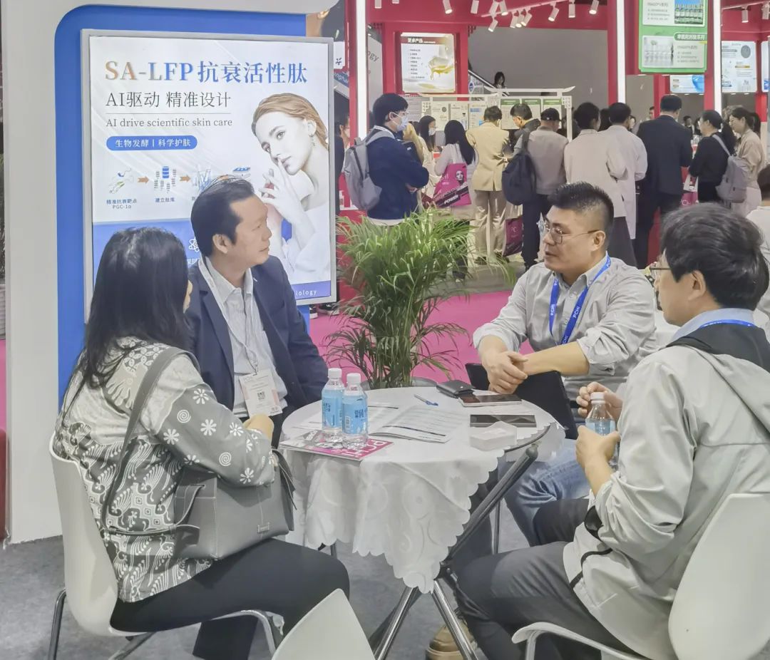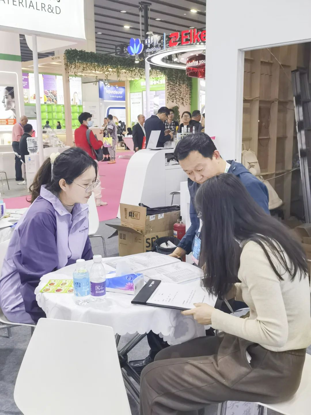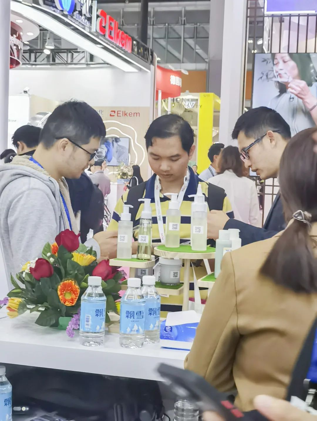 展会现场,展台上陈列的洁面、洗发、沐浴等配方样品以及全系列原料产品吸引着众多客户及行业精英驻足观摩,他们或仔细研究配方成分,或深入探讨应用场景,现场气氛热烈非凡。