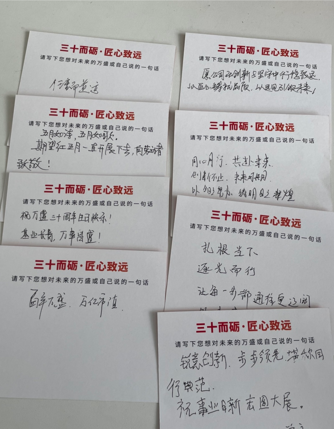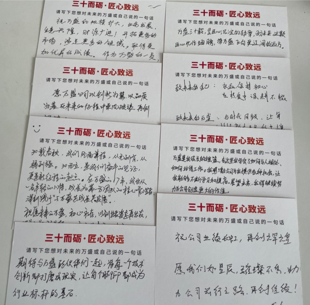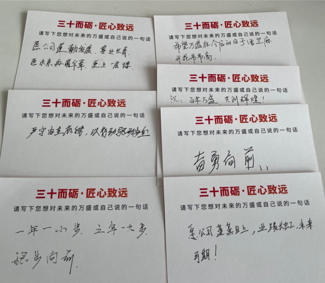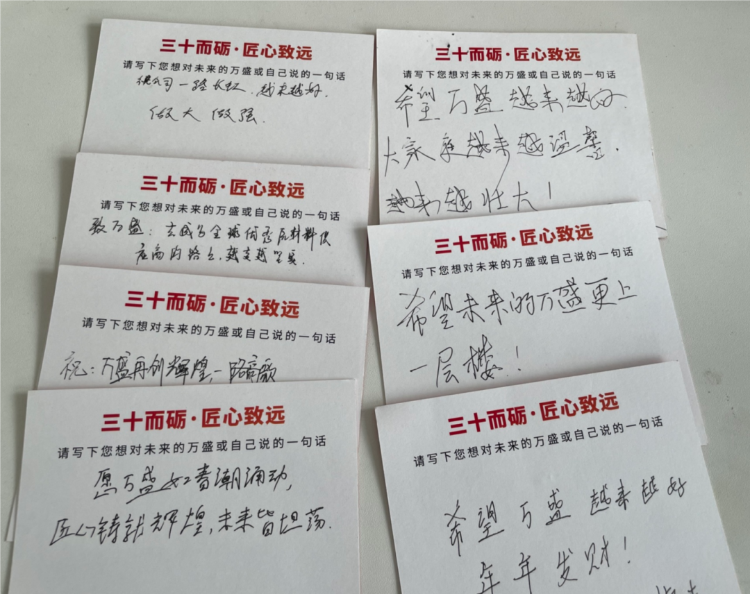 仪式的尾声温馨而充满希冀。与会人员纷纷在心愿卡片上写下寄语,大家将对个人成长的期许、对公司发展的美好祝愿倾注笔端。现场分享了部分人员的寄语,字里行间充满了对未来的憧憬和对万盛的热爱。这些承载着梦想与承诺的卡片,将被公司珍藏,成为激励未来前行的宝贵精神财富。