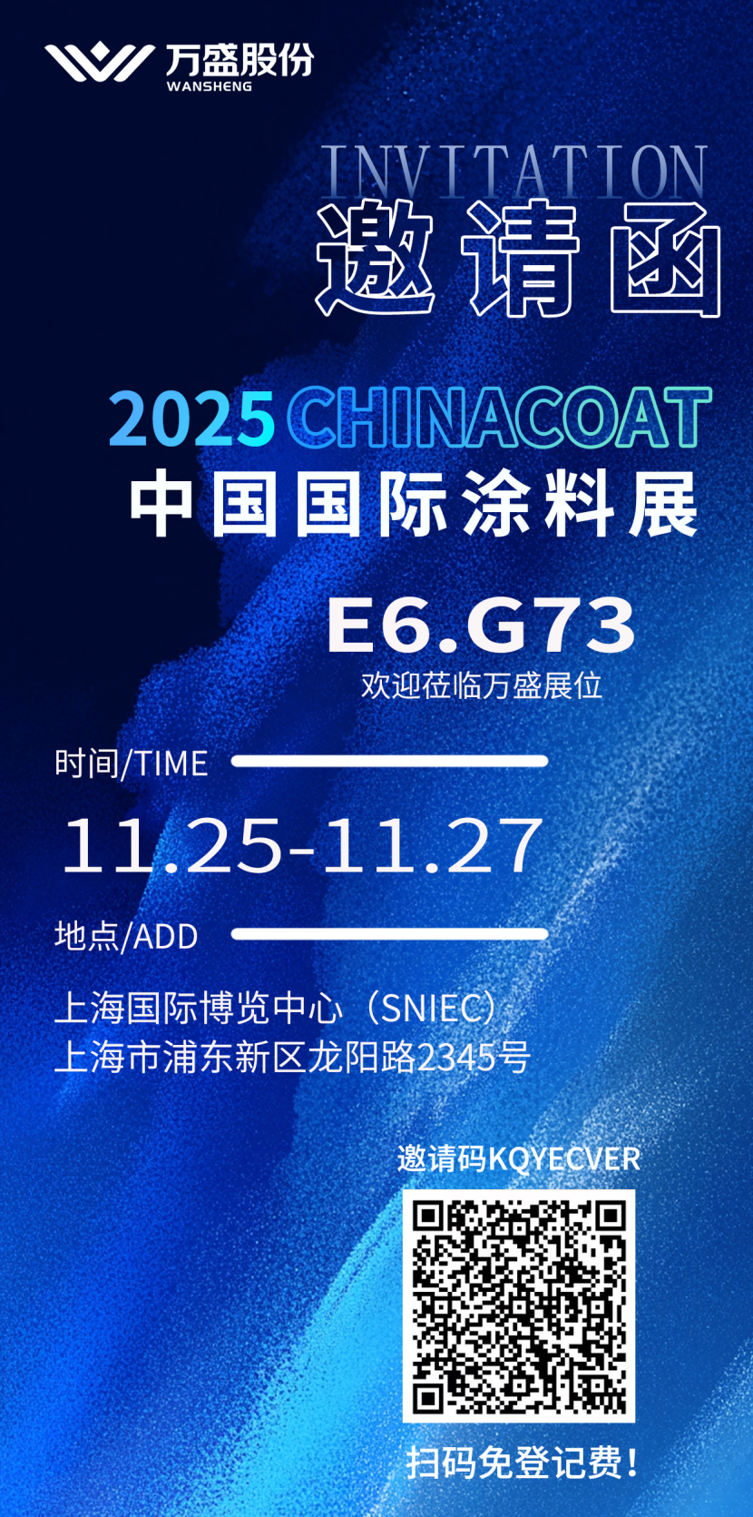 中国国际涂料展作为国际上极具影响力的专业展会,是涂料行业上下游企业交流与合作的重要平台。2025CHINACOAT即将在上海启幕,11月25-27日,万盛股份诚邀您莅临上海新国际博览中心E6馆G73展位,与我们共同探讨和分享技术与市场经验,携手开启合作共赢新篇章。