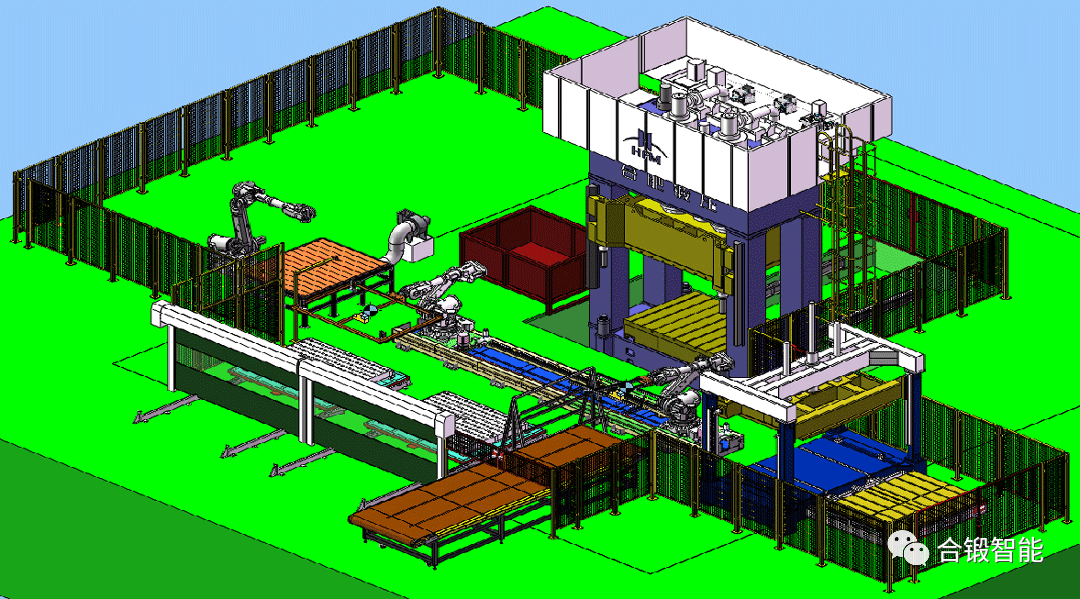 生产线由垛料上料小车(包含托盘及导向杆)、二维码扫码系统及模组、机械手R1/R2、拆垛上料端拾器、下料端拾器、电加热系统、下料滑台、预压液压机、安全防护围栏电气控制等组成,实现了全自动生产,并对每个工件进行打码,扫码,实现数据可追溯,与现代工业发展紧密结合。